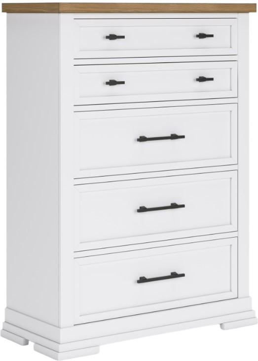 Casual style with substance. This Ashbryn two-tone chest of drawers raises the bar on comfortably cozy design in your soothing sanctuary. A sturdy silhouette with a classic white finish and black metal hardware exudes modern farmhouse vibes.Read More