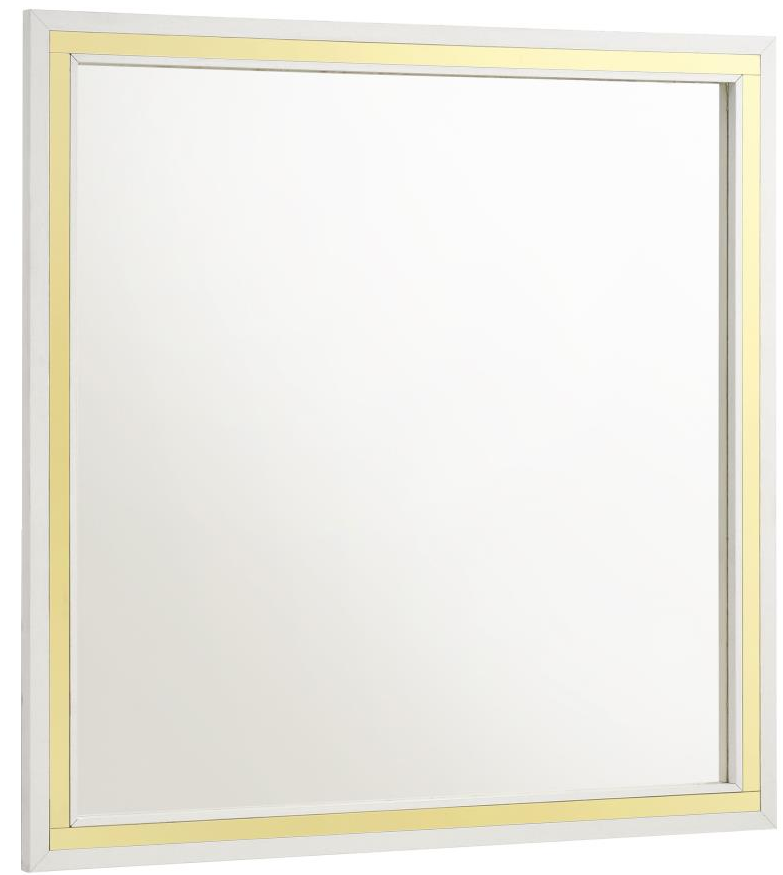 Put a glamorous finishing touch on your dresser with a modern framed mirror. Offering a polished touch of style, the mirror boasts a sleek, squared silhouette complete with a crisp white finish. Gleaming gold finish trim augments the front of the frame, creating a hint of warmth in an elegant bedroom.Read More
