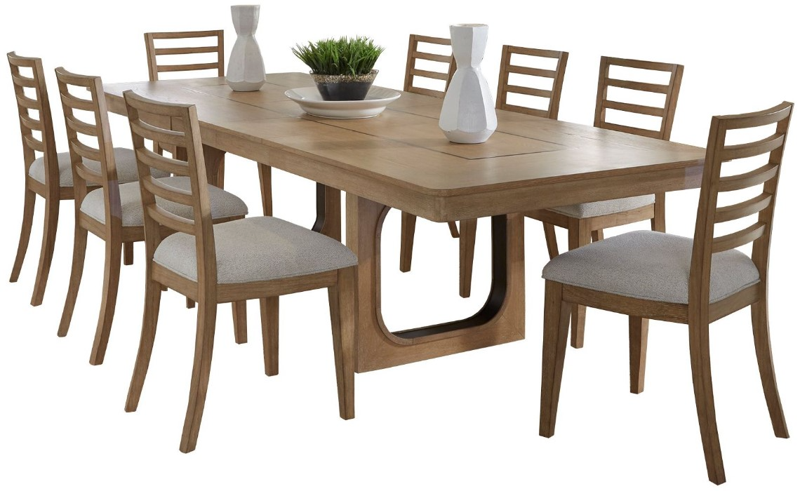 Set includes grand 84" rectangular table and eight (8) coordinating ladderback chairs
