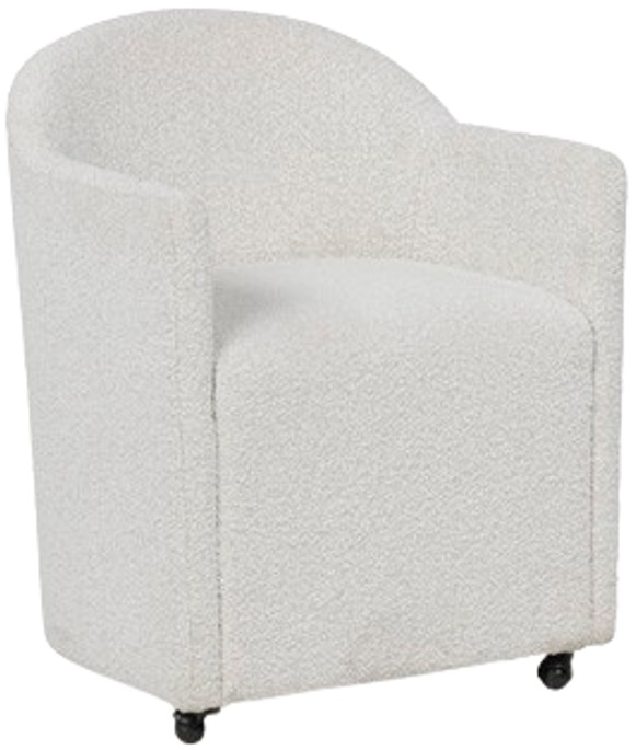 Anchor your dining space with the quiet confidence of this dining arm chair. Its barrel design is wrapped in a boucle-like fabric in off-white, for a modern aesthetic that feels effortlessly refined. And for day-to-day function, the cleanable and stain-resistant upholstery offers an expertly crafted balance of luxury and livability. Smooth-gliding casters allow you to rearrange with ease.Read More